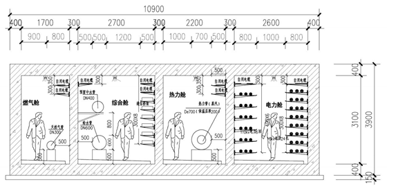 综合舱容纳约24孔梅花管通讯、DN600给水管,并预留一根DN400中水管管位;