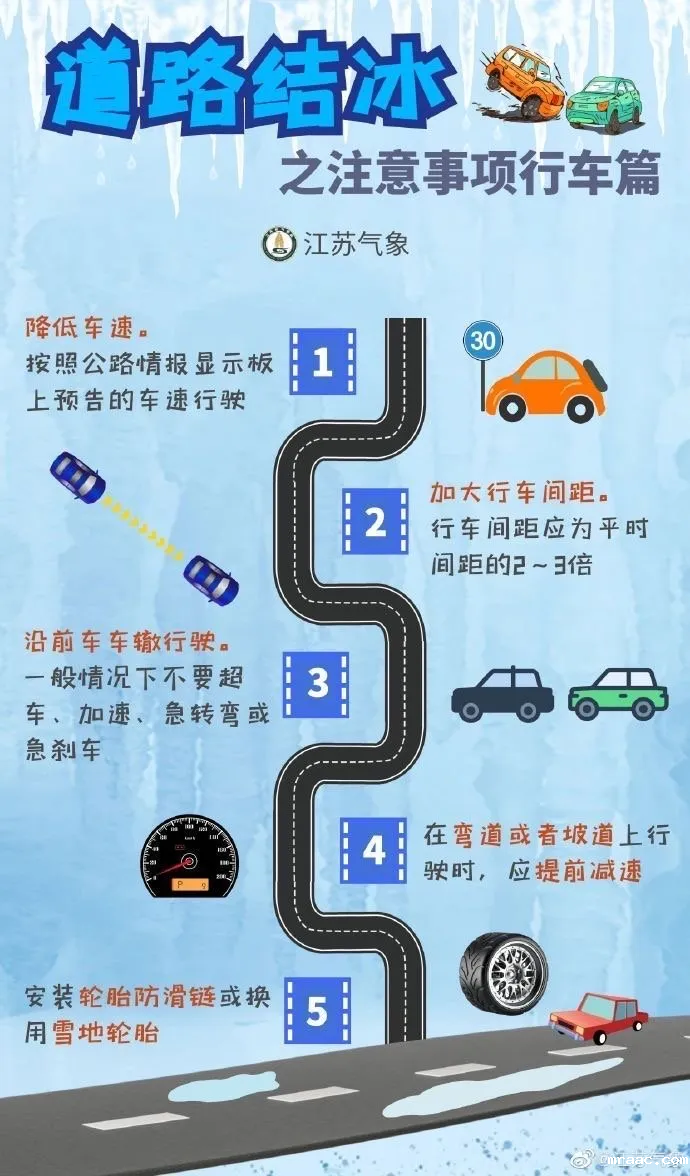 (二)出行前关注天气情况和实时路况信息,避开结冰及拥堵路段。(三)驾车出行采取防滑措施,注意降低车速,增加安全距离,减少并线超车,不要急踩刹车、猛打方向。(四)车辆发生轻微剐蹭、追尾等适用简易程序处理交通事故时快速处理,减少对交通的影响。(五)步行和骑行时小心路面湿滑,通过路口注意观察,确保安全。