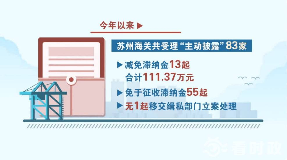 今年以来,苏州海关共受理“主动披露”83家,其中减免滞纳金13起,合计111.37万元,免于征收滞纳金55起,无一起移交缉私部门立案处理。