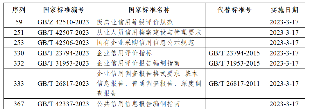 同期还发布了《饭店业信用等级评价规范》、《国有企业采购信用信息公示规范》、《企业信用评价指标》、《企业信用评价报告编制指南》、《企业信用调查报告格式要求基本信息报告、普通调查报告、深度调查报告》、《公共信用信息报告编制指南》六项国家标准。