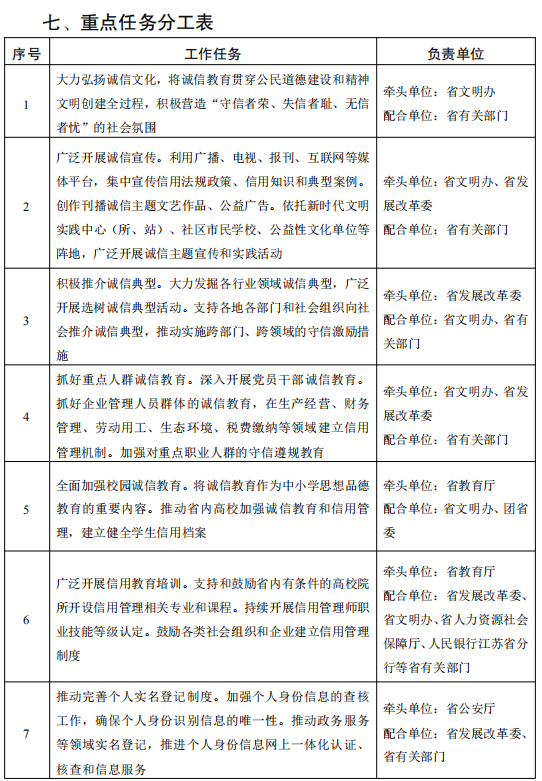 (三)强化责任落实。各地各部门要结合工作实际,强化协同联动,细化任务分工,认真抓好个人诚信体系建设各项工作。省社会信用综合管理部门要及时总结个人诚信体系建设工作成效,推广可复制、可借鉴的创新做法。鼓励和调动社会力量广泛参与“诚信江苏”建设,提高社会关注度、认知度、感受度,形成个人诚信建设的强大合力。