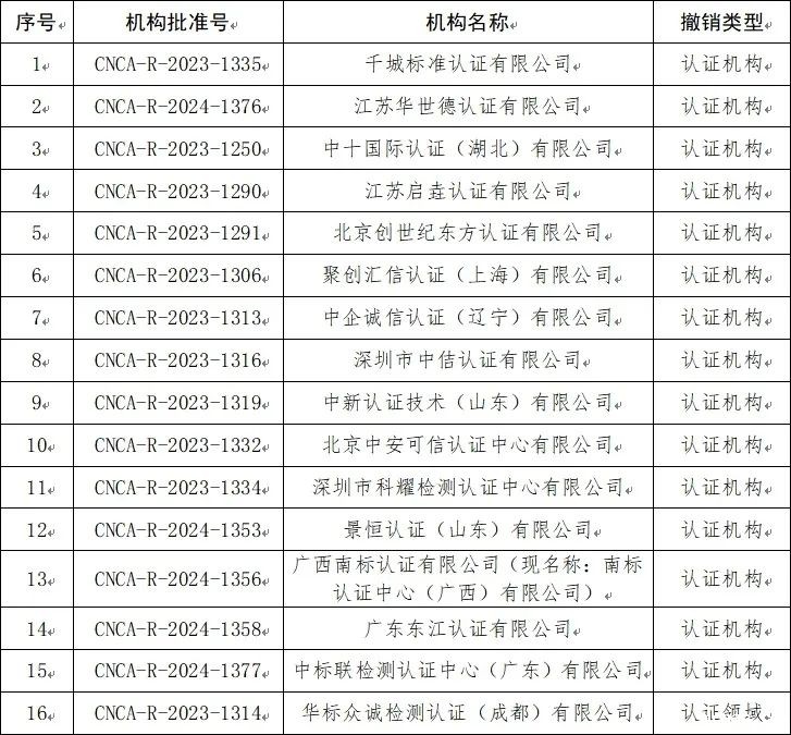 依据《中华人民共和国行政许可法》第六十九条、《认证机构管理办法》第三十一条有关规定,决定撤销16家认证机构批准资质和业务领域。