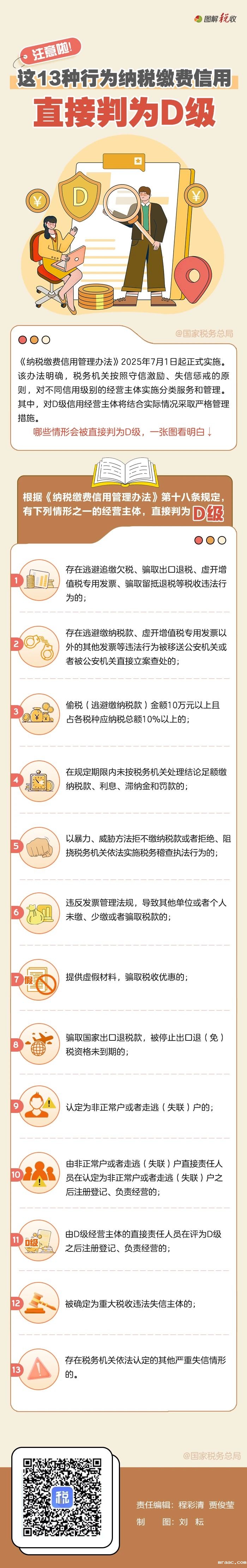 为了规范纳税缴费信用管理,促进纳税人缴费人诚信自律,提高税法遵从度,推进社会信用体系建设,国家税务总局发布《纳税缴费信用管理办法》。哪些情形会被直接判为D级?一张图带你看明白↓