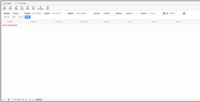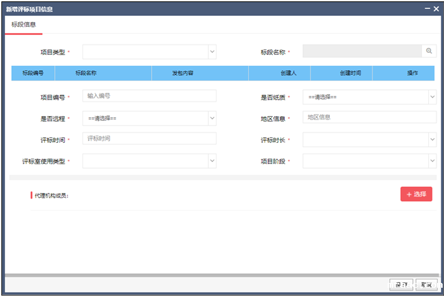代理企业人员登录管理系统点击【评标区管理】—【评标项目信息】打开评标项目信息页面,该页面主要用于对本企业的评标项目进行增加、删除、修改、查看操作;