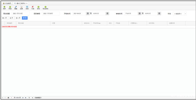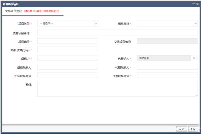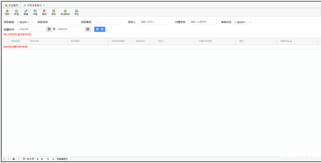 代理企业人员登录管理系统点击【项目基础信息】—【项目信息登记】打开项目信息登记页面,该页面主要用于对本企业的交易项目进行增加、删除、修改、查看等操作;