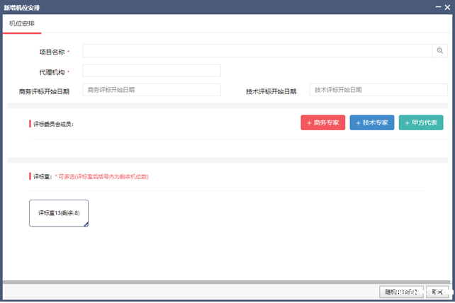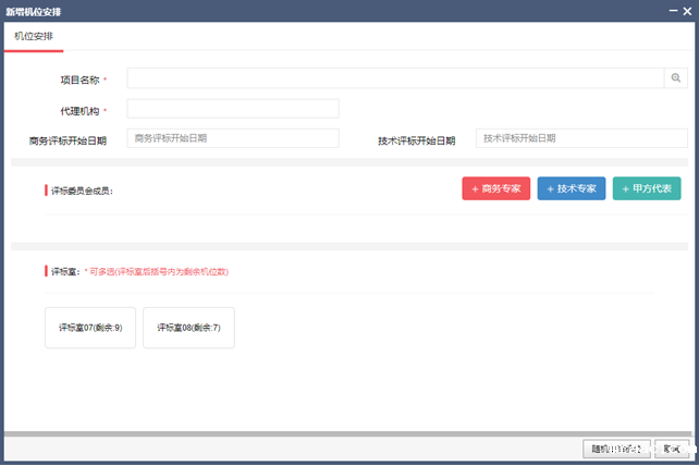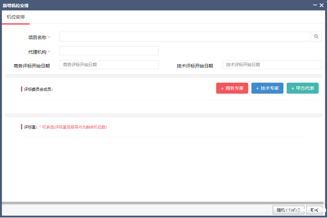 新增政府采购项目的评标安排:输入 / 选择相应信息后点击“随机安排机位”即可;