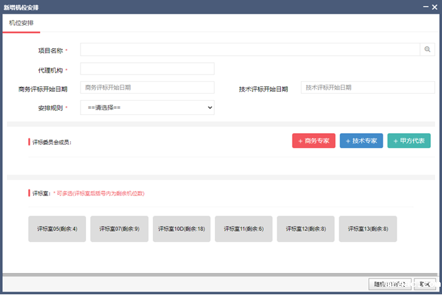 新增建设工程项目的评标安排:输入 / 选择相应信息后点击“随机安排机位”即可;