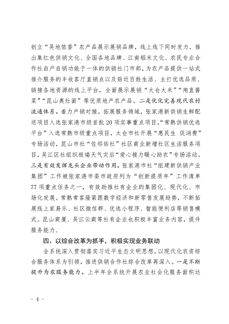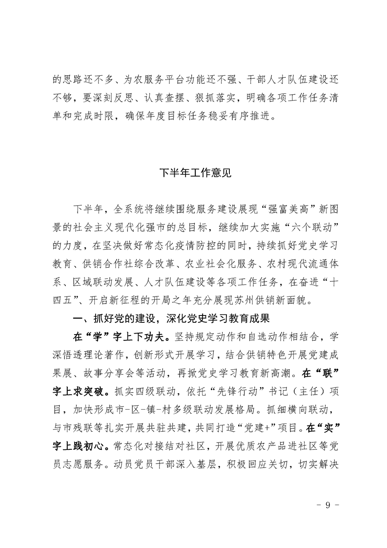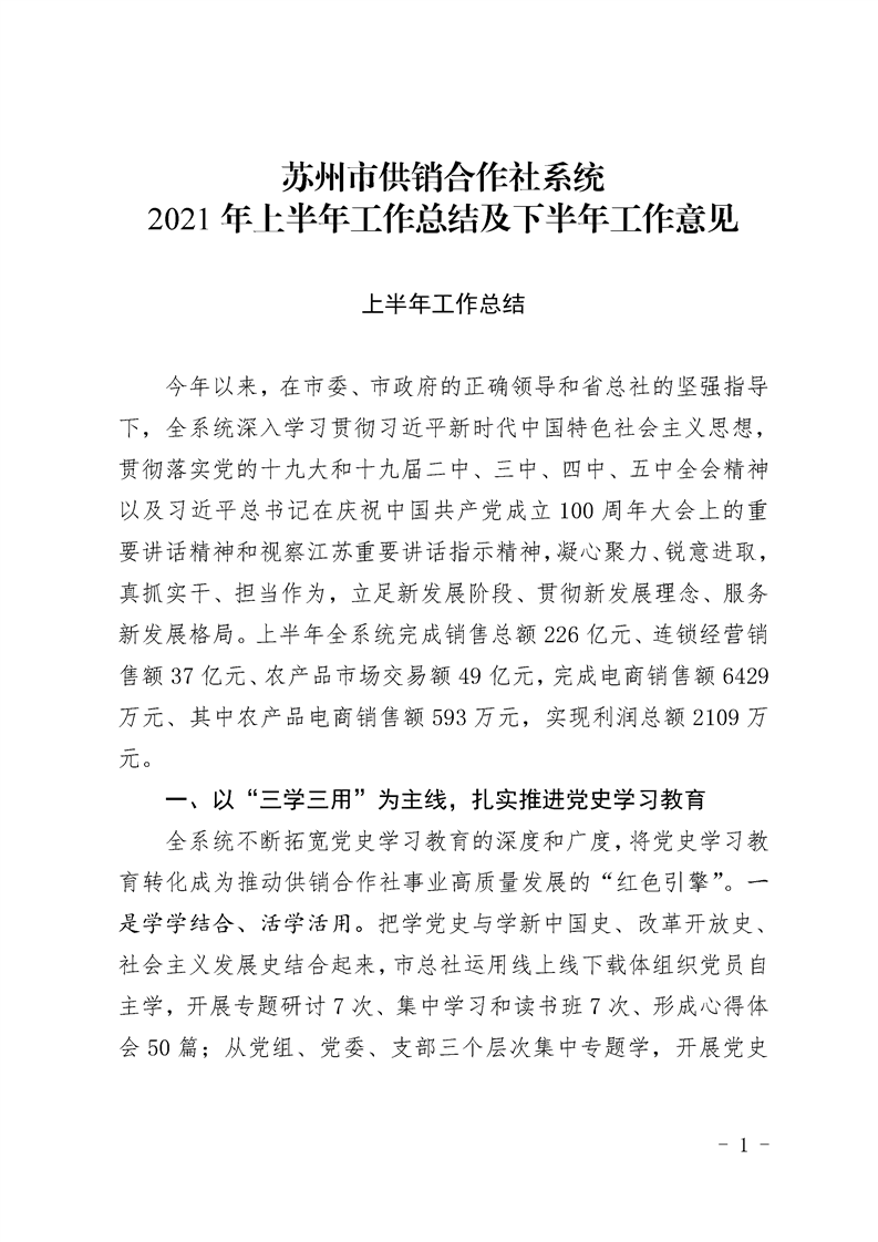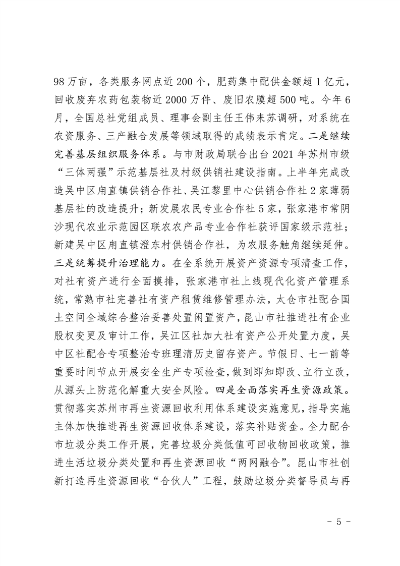 苏州市供销合作社系统2021年上半年工作总结和下半年工作意见