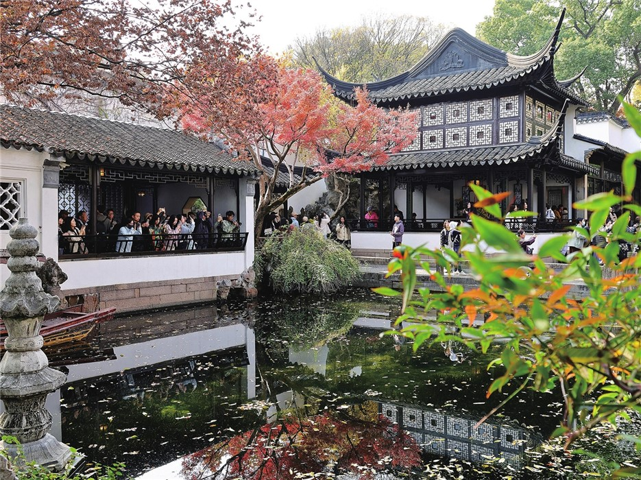 古典庭園の留園では、銀杏が黄色になり、紅葉が火のように赤く、古い建物はカラフルな木の葉と一緒に美しい絵を描いており、多くの国内外の観光客の目を引き付けた。