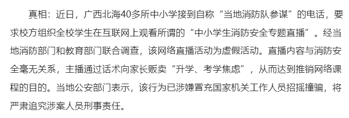 学校办公室接到陌生电话,称自己是消防大队宣传科的工作人员,要求学校张贴消防宣传海报,然后再次发通知,要求学生和家长一同在晚间观看安全教育直播,并提供了直播入口链接。幸好老师反应及时,立即与辖区所属消防救援队站联系,经核实确认并无此事,此人不是该大队宣传人员,此为骗局!