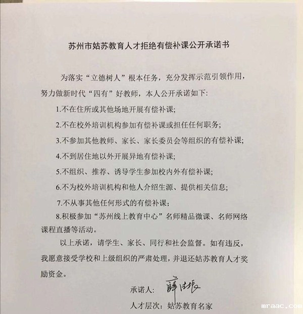 日前,薛法根、朱开群、潘娜等“姑苏教育名家”倡议:拒绝有偿补课,参与苏州线上教育。并带头庄重签名承诺:不从事任何形式的有偿补课;积极参加“苏州线上教育中心”开展的名师精品微课、名师网络课程直播等活动。请学生、家长、同行和社会监督。如有违反,愿意接受学校和上级组织的严肃处理,并退还姑苏教育人才奖励及相关资金。