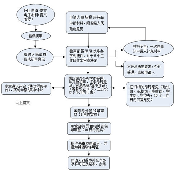 申请设立实施本科以上高等学历教育中外合作办学机构的,申请人通过省级人民政府初审后(网上提交材料),由省级人民政府出具意见函并一式5份申报材料报教育部国际司办学处。
