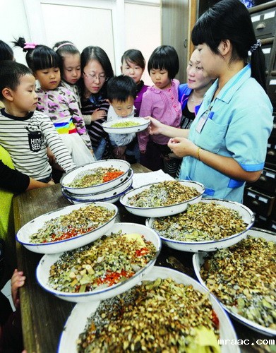 A shop assistant shows tra-ditional Chinese herbal medicines to children and their parents on October 21. To celebrate the Traditional Chinese Medicine (TCM) Day on October 22, Suzhou Guan-jing Kindergarten arranged a visit to a long-established TCM store near Changmen in the hope that children will learn more about TCM and accumulate interest in TCM culture. (Photo by Hang Xing-wei/ Suzhou Daily)