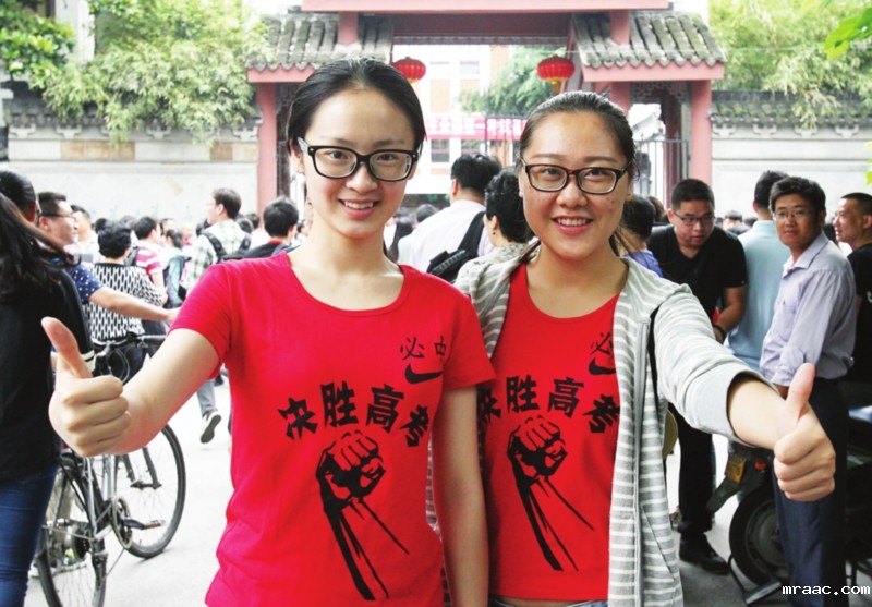 Two students from No.Four Middle School pose outside No.Ten Middle School,where they sit for the college entrance examon June7.Their custom-madet-shirt read"perform well in the college entrance exam and successfully enroll in auniversity" (PhotobyHuaXuegen/SuzhouDaily)