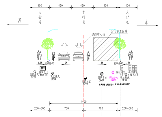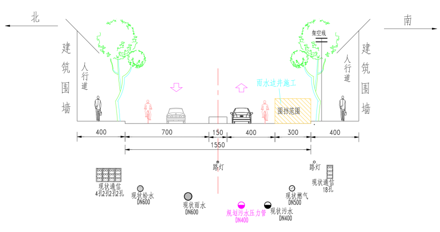 因雨水支管需要过路施工,影响较大,分东西半幅利用夜间20时-次日凌晨5时施工,施工占用车行道约4.5米。施工期间,机动车、非机动车及行人利用剩余路幅正常双向通行,机动车道宽约3-4米,非机动车道宽约2.5米。凌晨5时以后拆除部分围挡,仅围挡井盖周围约2米*2米作为养护范围。