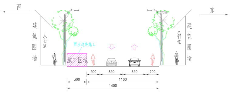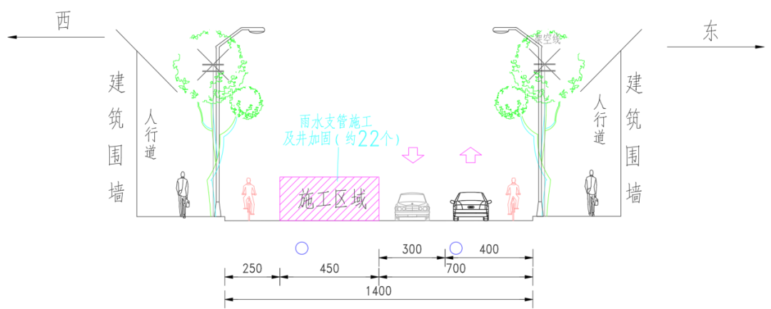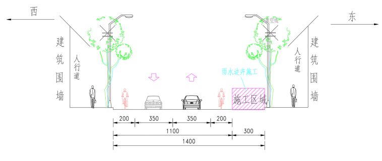 雨水边井、雨水支管及井加固施工剩余路幅,分两个阶段施工。第一阶段围挡中间车道,占车行道宽约4米,第二阶段北侧围挡剩余东半幅,南侧围挡剩余西半幅,均占车行道宽约5米,保证剩余双向车行道宽约8-10米,施工期间机动车和非机动车混行,行人正常通行。