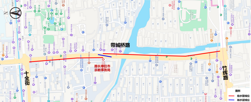 带城桥路北起十全街,南至竹辉路,全长约560m。主要施工给水管、局部雨水管、雨水边井、雨水支管及井加固。