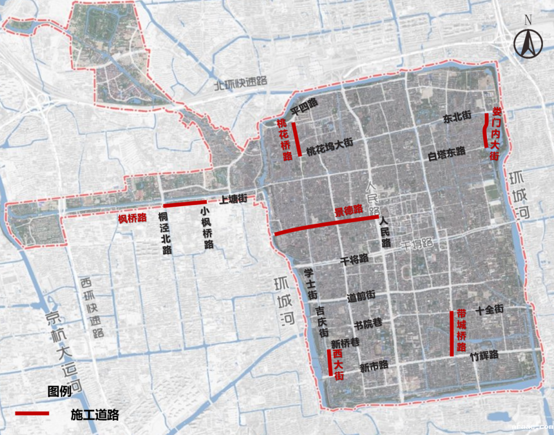 根据古城道路精细化提升计划以及市政府专题会议工作安排,需对桃花桥路、景德路、枫桥路东段、西大街、带城桥路、娄门内大街实施管线施工、道路提升。