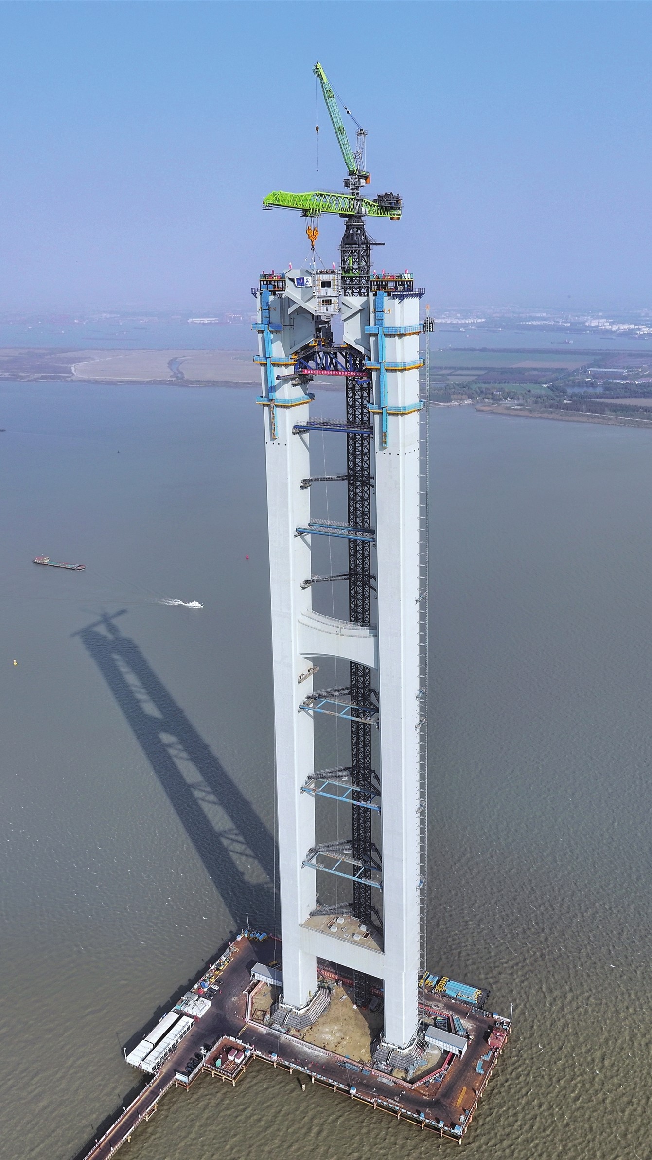 昨天(12月1日),随着南航道桥南主塔上横梁完成“云端合龙”,目前世界最高悬索桥索塔——张靖皋长江大桥南航道桥南主塔顺利封顶。至此,大桥南、北航道桥四座主塔主体结构全面完工。