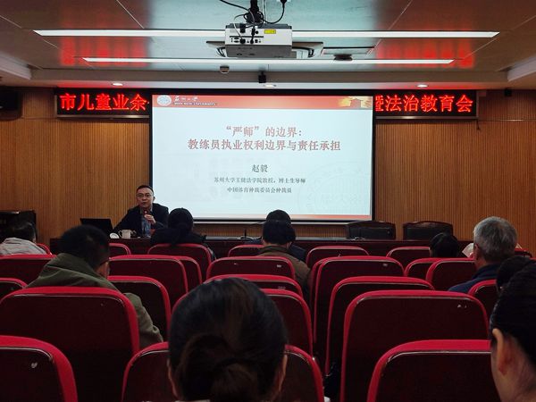 会议还特别特邀了苏州大学王健法学院教授、博士生导师、中国体育仲裁委员会仲裁员赵毅,为我校全体教职工开展了题为“严师的边界:教练员执业权利边界与责任承担”的法治教育专题讲座。
