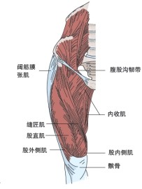 股四头肌由股直肌、股内侧肌、股外侧肌及股中间肌四肌组成,各肌均有其单独的起点,在下部互相融合成一坚强的股四头肌腱,止于髌骨,并向下延长成为髌韧带。股四头肌是人体体积最大的一块肌肉,位于大腿前面,占下肢体表面较大面积,股骨中1/3全部、上1/3大部及下1/3全为股内侧肌、股外侧肌及股中间肌所包围,在运动和日常体力活动中易遭受挫伤。