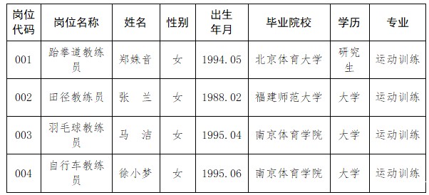 根据《2022年苏州市体育局直属事业单位公开招聘紧缺型体育教练员公告》,经过面试、体检和考核合格,拟录用以下4名同志,现公示如下:
