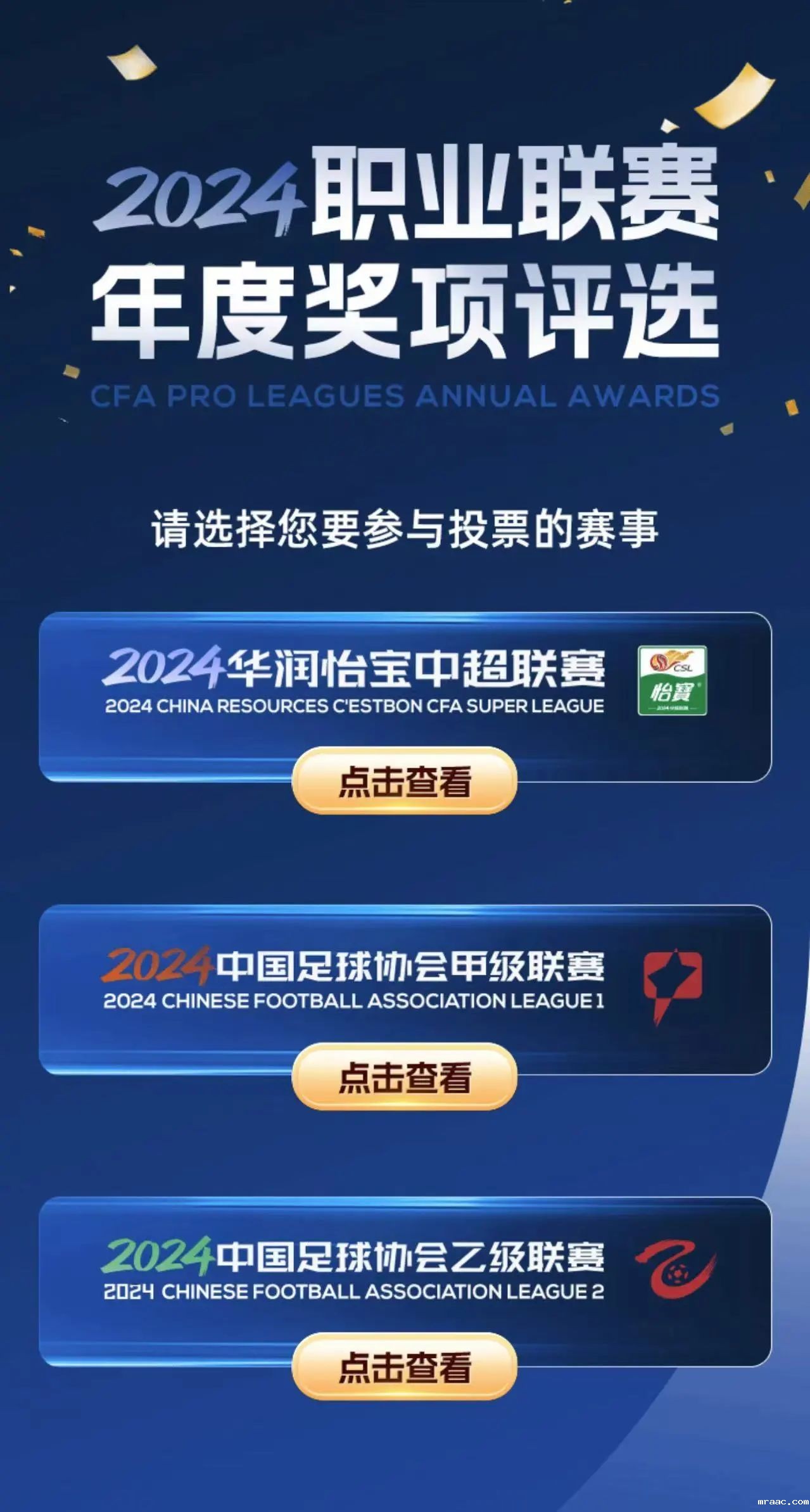 近日,2024华润怡宝中超联赛、2024中国足球协会甲级联赛与2024中国足球协会乙级联赛的年度最佳评选投票均已开启。截至12月24日晚23:59,广大球迷可为自己心目中的年度最佳球员、年度最佳守门员、年度最佳教练、年度最佳青年球员与年度优秀社会责任俱乐部投上宝贵的一票。