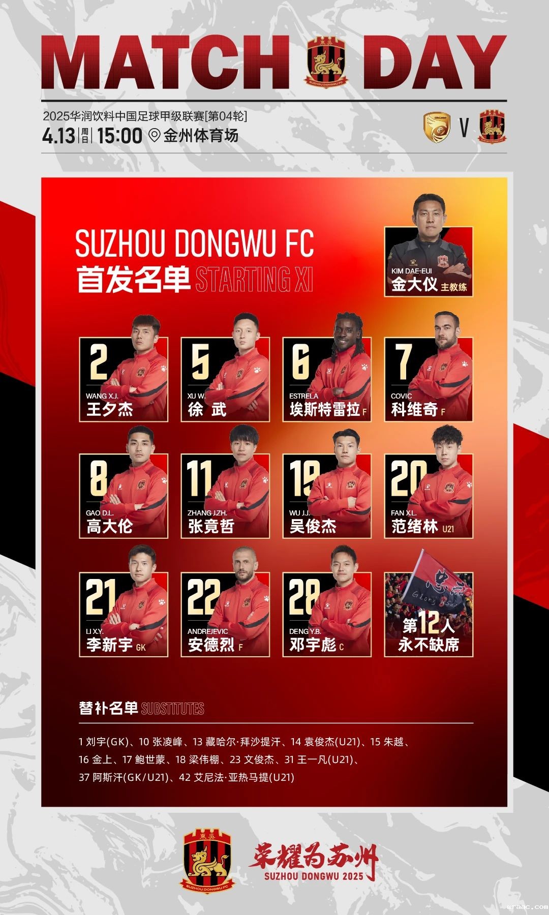 北京时间4月13日15:00,2025中国足球甲级联赛第4轮,苏州东吴在大连金州体育场对阵大连鲲城,开启三连客的首场征程。上半场比赛,邓宇彪禁区内抽射造险;下半场易边再战,梁伟棚头球险些破门。