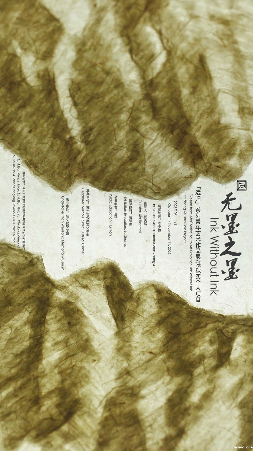10月1日起,“远归”系列青年艺术作品展之:无墨之墨——张秋实个人项目将在颜文樑纪念馆微展厅展出。