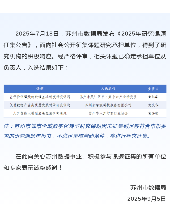 苏州市数据局2025年研究课题征集入选结果公告