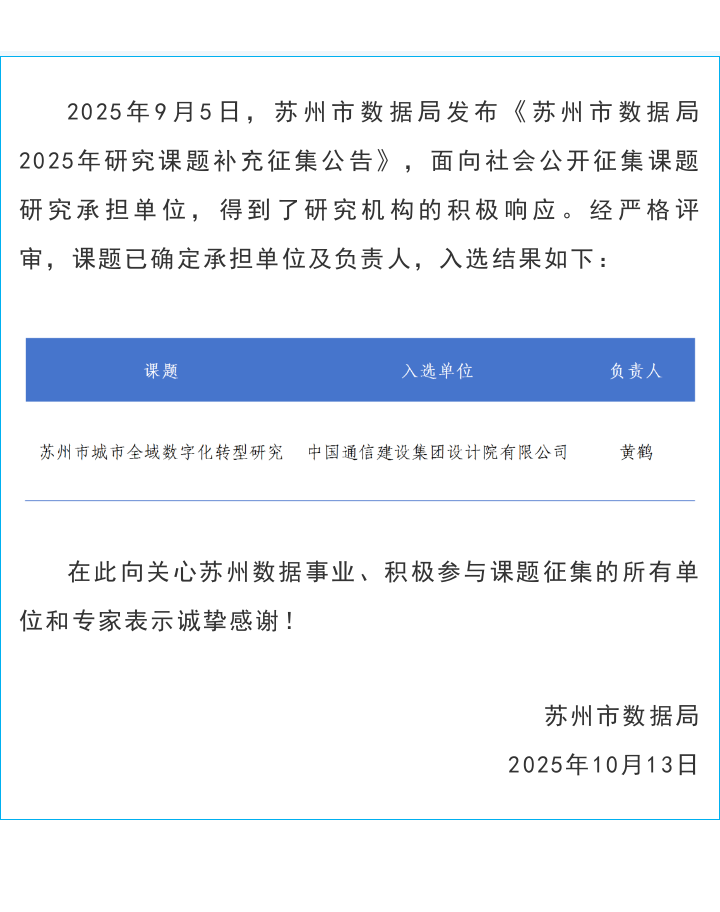 苏州市数据局2025年研究课题补充征集入选结果公告