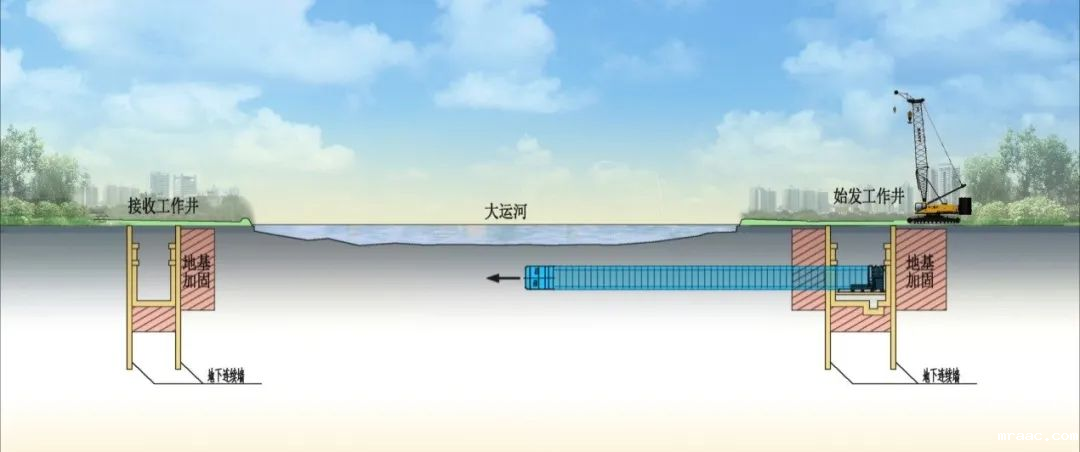 隧道核心段下穿京杭大运河,采用成套非开挖顶管施工工法穿越,避免了对大运河历史文物和两岸绿化的破坏和对大运河繁忙航道的影响。这是苏州市首个,也是目前国内首次采用大断面、长距离矩形顶管的方式下穿京杭大运河的车行隧道,由于存在长距离穿越主航道、河道顶进覆土层浅、涉水底面沉降控制等施工难点,其施工难度、断面大小和顶进长度为国内采用矩形顶管建造市政穿河车行隧道之最。