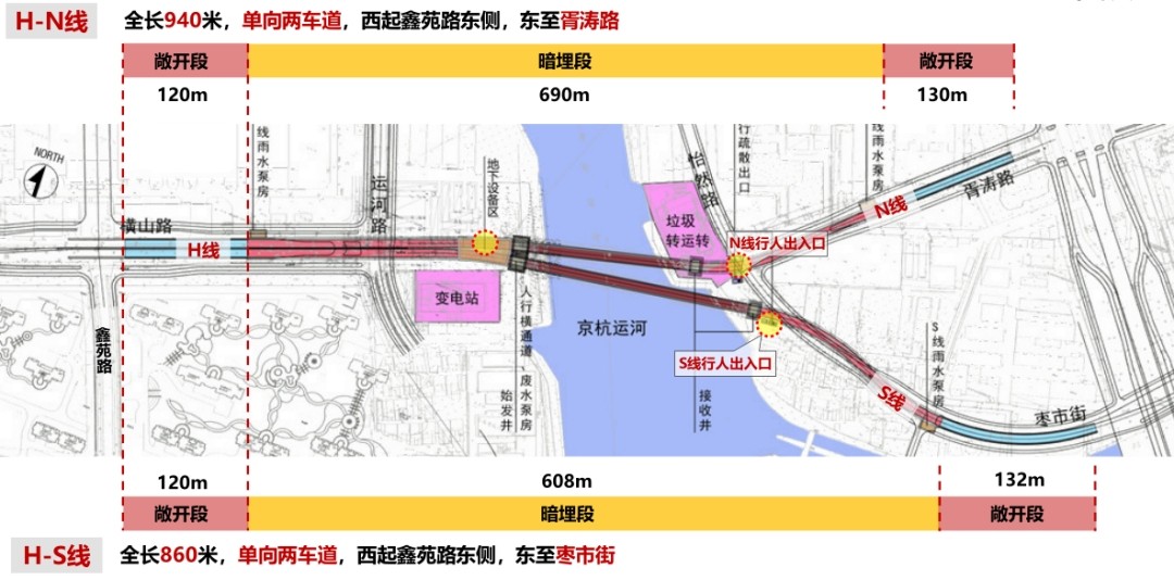 大运河隧道,西起横山路鑫苑路交叉口,沿横山路向东,下穿京杭运河后分叉南北两线,北入口对接胥涛路总长约896米;南出口对接枣市街总长约1293米,为机动车专用隧道。